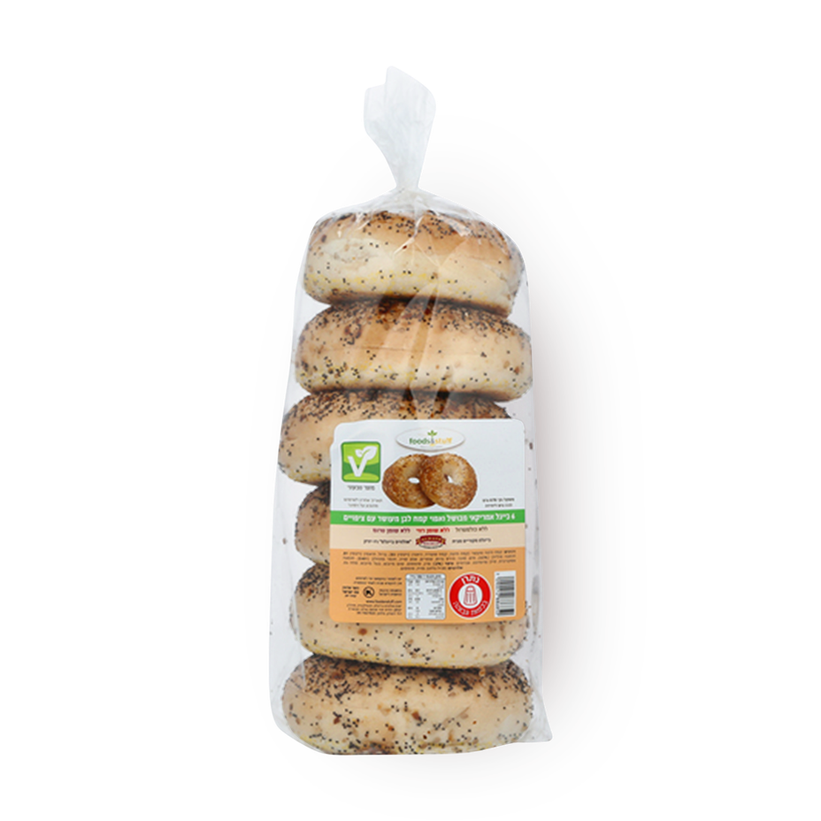 Pack of 6 American bagels with white flour and eveything, cooked and baked. The product arrives frozen coating: poppy, sesame, dried garlic, dried onion, coarse salt