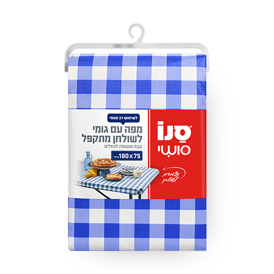 Blue and white checked rubber tablecloth for a folding table, for multiple use. Thick and impervious to looms 180x75 cm. Made of soft flannel in the lower part and washable plastic in the upper part. Can be wiped and cleaned easily and quickly. Multiple use. Sticks to the table