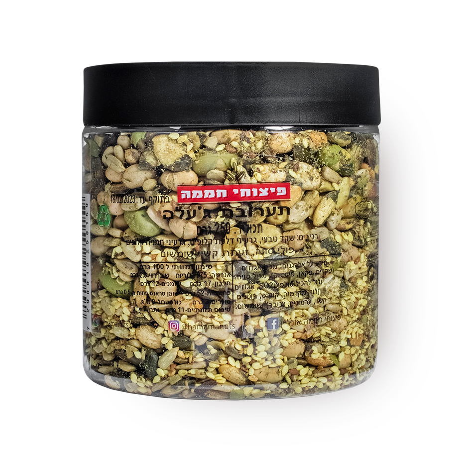 Natural almond, peeled pumpkin seeds, peeled sunflower seeds, soybeans, za'atar, cashews, sesame