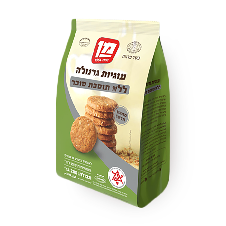 Soft wheat flour (contains gluten), vegetable oil (palm oil), granola (oats 14%, whole wheat flakes 8.6%, sesame 2.3%), sweetener: maltitol, stabilizer (polydextrose), soy flour, table salt, raising agents: baking soda E-500, ammonium bicarbonate E-503, sweetener: sucralose, flavors.