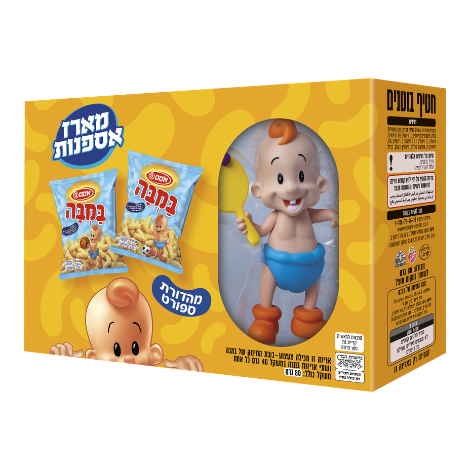 The package contains: the Bamba baby doll with a paddle, plus 2 packs of Bamba, 40 grams each. The blue package is inside the yellow package. There is one Bamba baby doll in the package.
