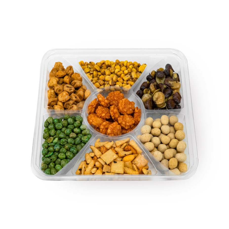 Menchis mix, fried Egyptian beans, roasted peas, spicy rice crackers, corn miassy peanuts, grilled ravioli, corn.
