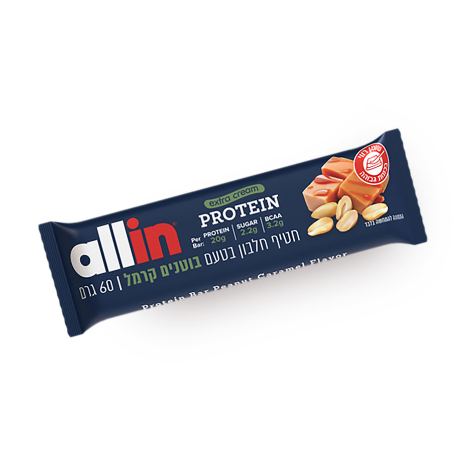 11.9 ₪ instead of standard 16.9 ₪Tagged ingredients: gluten, kosher19.83 ₪ / 100 g - allin Protein Bar Banana Toffee flavor extra cream60 g
