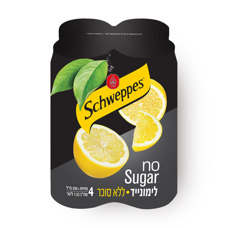 15.9 ₪ instead of standard 21.9 ₪Tagged ingredients: High Sugar, kosher1.2 ₪ / 100 ml - Schweppes lemonade Pack4 × 330 ml