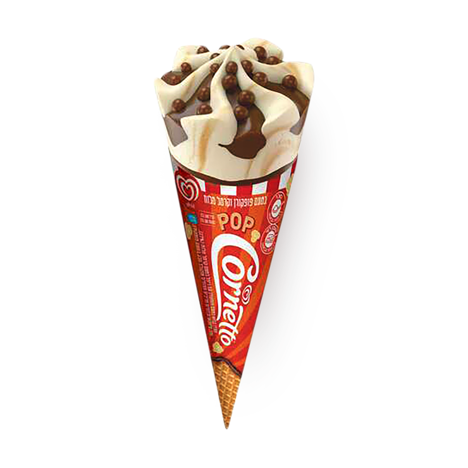 POPCORNETTO - טילון קורנטו בטעם הפופקורן האהוב בשילוב עם קרמל מלוח! מעדן קפוא בטעם פופקורן עם ריפל בטעם קרמל מלוח, ופל, צימקאו וכדורים פריכים מצופים שוקולד חלב בטעם פופקורן.