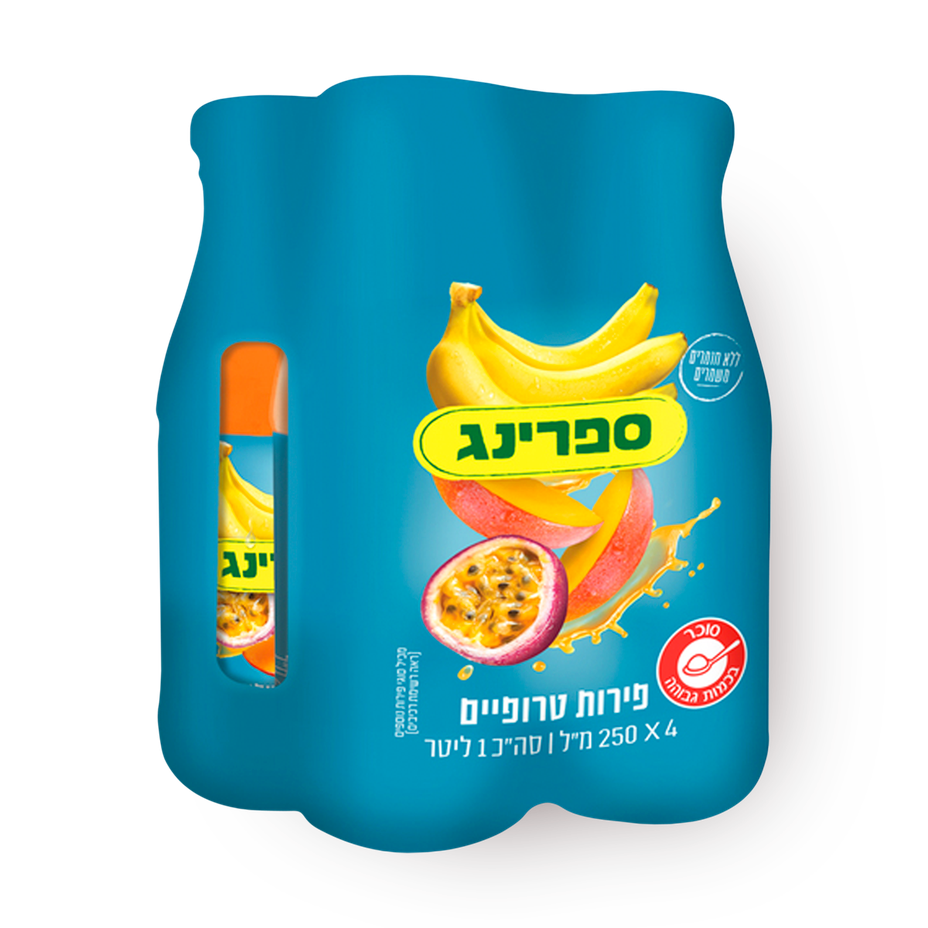 מים, פירות טרופיים (מחית בננה, פסיפלורה*, מחית מנגו*) (9%), סוכר, מיץ תפוזים* (5%), מיץ תפוחים* (2%) (מכיל 10% או יותר רכיבי פרי), חומצה (חומצת לימון), מייצב טבעי (פקטין), צבע מאכל (בטא קרוטן, בפסח-רכז גזר, רכז קורטם), מעכב חמצון- חומצה אסקורבית (ויטמין C), חומרי טעם וריח. *עשוי מרכז.
