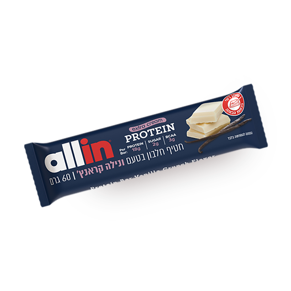 16.9 ₪Tagged ingredients: gluten, High Saturated Fat, kosher28.17 ₪ / 100 g - allin Extra Soft Protein Bar White Chocolate Peanuts Caramel Flavor55 g