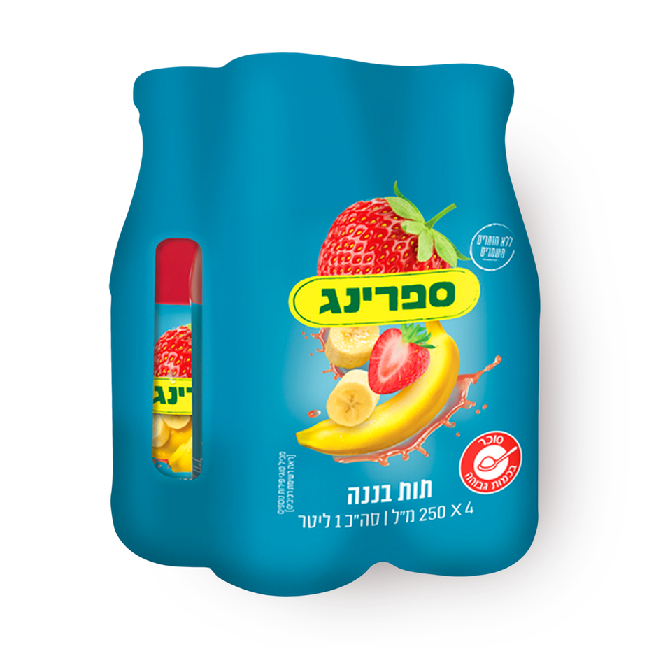 מים,סוכר,מחית תות שדה* (6%),מחית בננה* (4%) מיצי פירות* (תפוזים ,תפוחים,פסיפלורה)(מכיל 10% או יותר רכיבי פרי),מייצב טבעי (E418,בפסח:פקטין) חומצה (חומצת לימון),רכז גזר סגול,חומרי טעם וריח. *עשוי מרכז