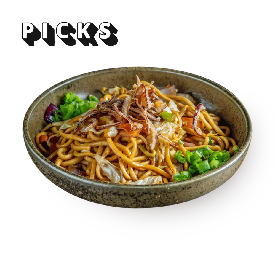 Egg noodles [contains: flour, pasteurized egg liquid, tapioca starch, wheat gluten, salt][gluten], yoffa, cabbage, soy sauce [gluten], carrot, Chinese sprouts, refined canola oil, onion, green onion, water, Sweet soy sauce [gluten] mushroom sauce [gluten] mixed and refined vegetable oil [sesame + soy], white sugar, ginger, garlic, soy sauce [gluten], white pepper vinegar.