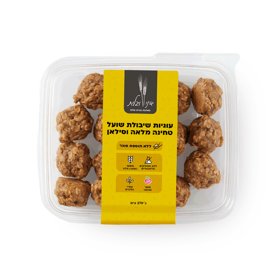 Cookies based on full Ethiopian tahini and oats. No flour at all! We added dried blueberries, whole sesame and walnuts to it. The cookies are baked with refined sweetness with natural date silan and are rich in dietary fiber. No red label sugar and no artificial sweeteners. The daughter of veganfriendly is marked - no eggs, no milk and no animal products.