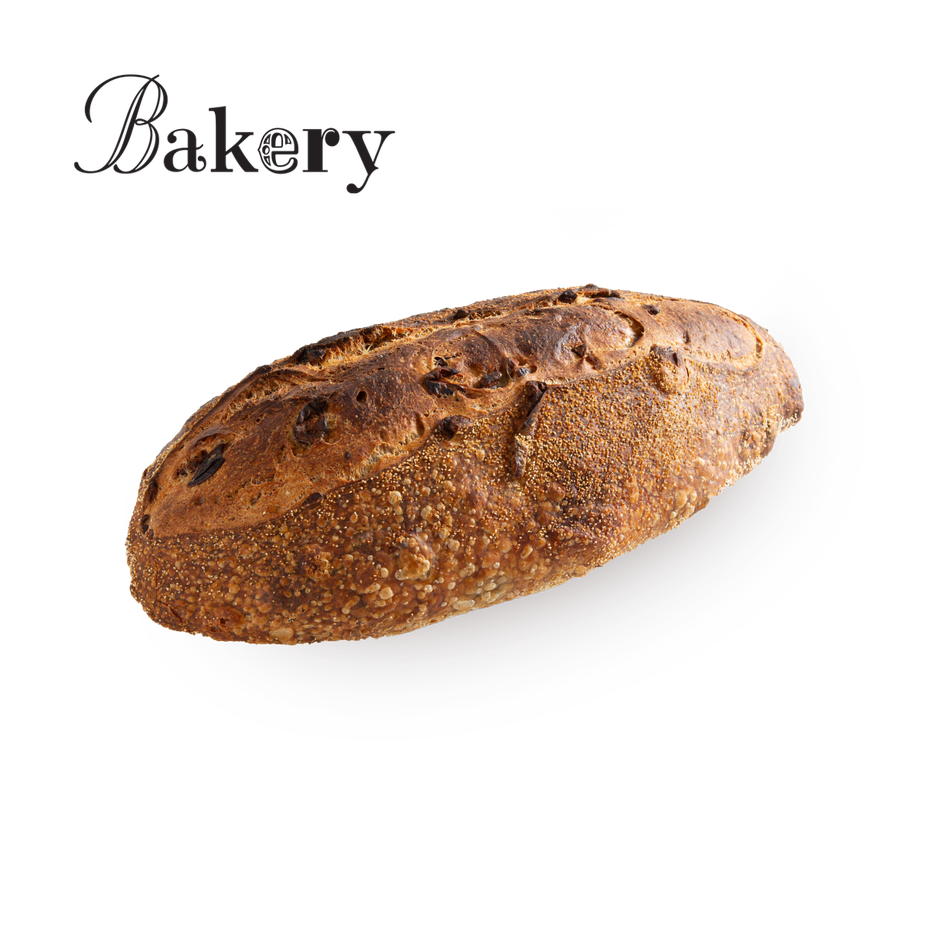 Sourdough bread with wholemeal flour plus olives Crispy on the outside. Suitable for soft and hard cheeses.