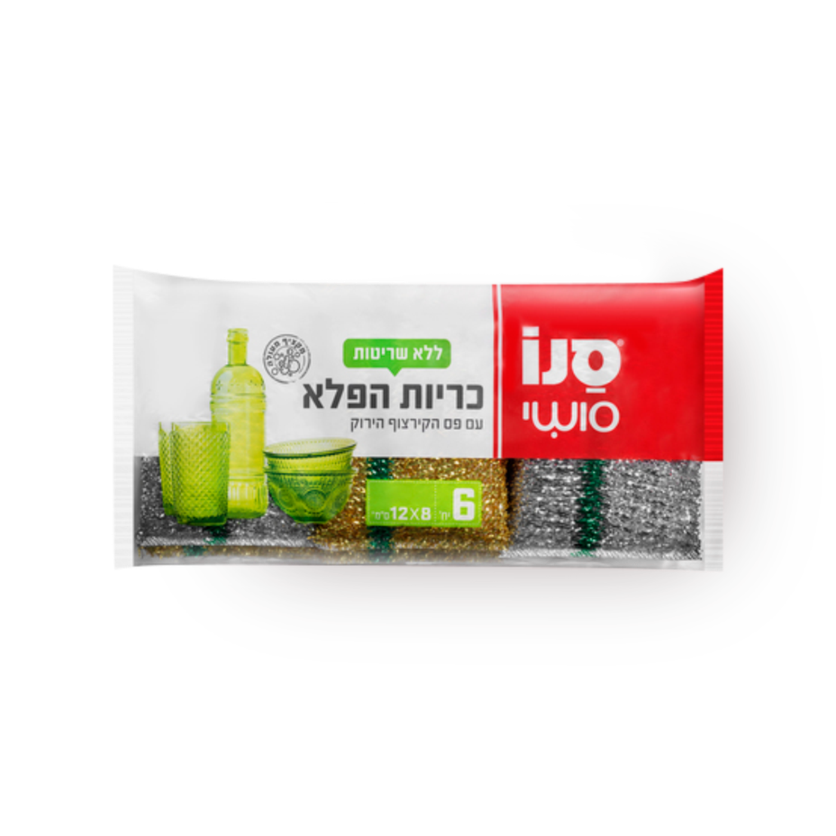 כריות הפלא *6 כריות קרצוף רב תכליתיות בגודל 12X8 סמ *בעלות פס הקרצוף הירוק לניקוי יסודי של הלכלוך *עם ספוג עבה ואיכותי בעל כושר הקצפה גבוה *לניקוי וקרצוף ללא שריטות