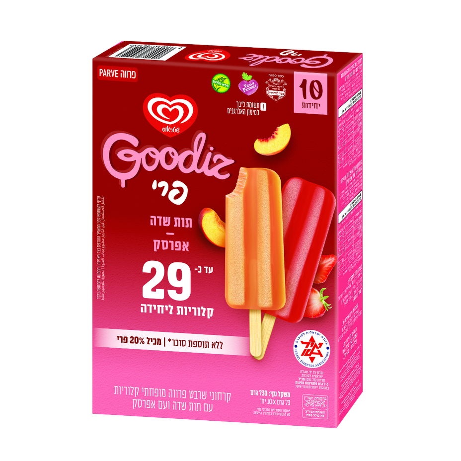 Goodies Fruit Ice Cream Cones Reduced Calories with Strawberry and Peach. Contains 20% fruit. No added sugar. Gluten free. Vegan friendly