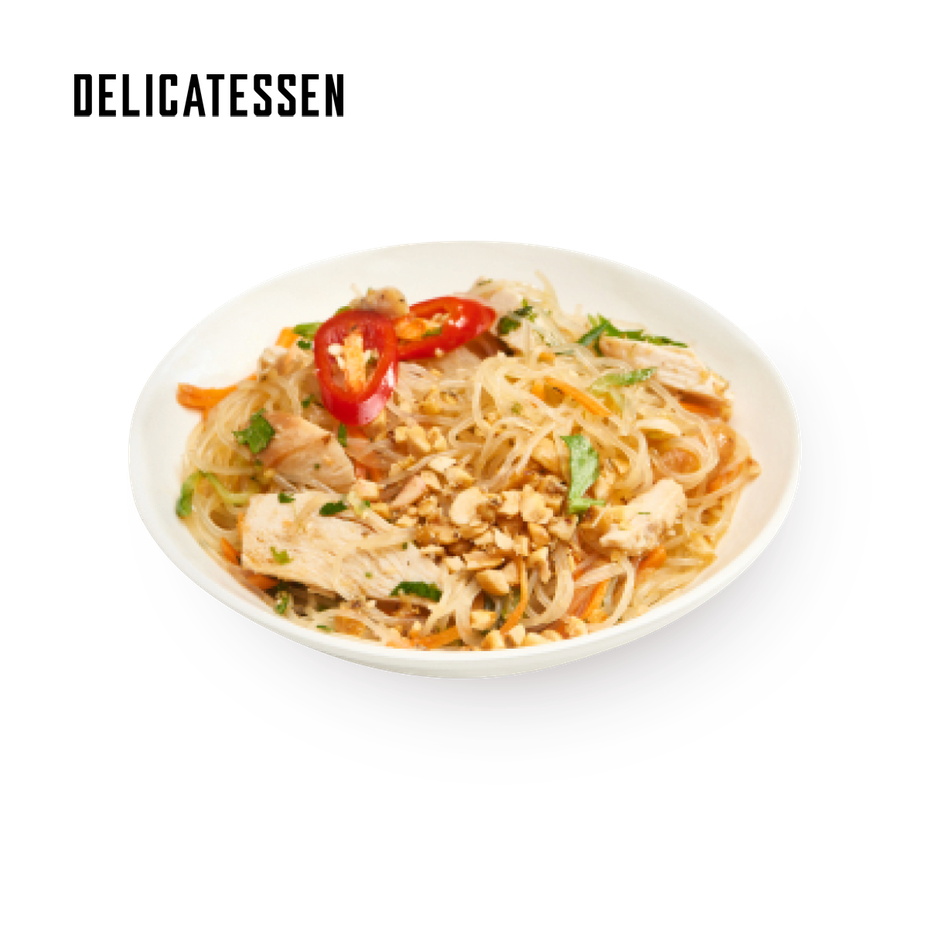 Bean noodles(64%), carrots, soy sauce, palm sugar, fish sauce, rice vinegar, peanuts, hot red pepper, onions, soy sauce(gluten), lemon juice, soybean oil, white sugar, garlic, celery, coriander, lime juice, cucumber, sesame oil, ginger, mint, chili oil, table salt.