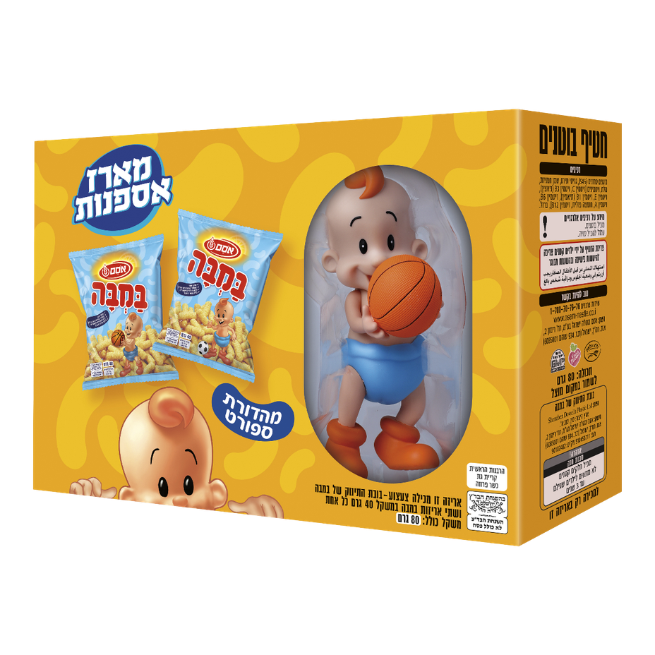 The package contains: the Bamba baby doll with a basketball, plus 2 packs of Bamba, 40 grams each. The blue package is inside the yellow package. There is one Bamba baby doll in the package.
