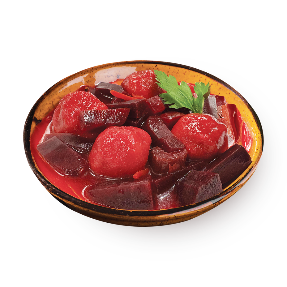 Water, Cuba 37% [water, wheat semolina (contains gluten), ground beef 6%, onion, canola oil, bulgur (wheat), salt, spices, sugar], beetroot 14%, onion, carrot, celery, sugar, Concentrated tomato sauce, salt, canola oil, chicken flavored soup powder [salt, sugar, starches, maltodextrin, flavor enhancers (monosodium glutamate E631, E627), vegetable oil, dried parsley, flavoring agents, spices], acidity regulator (citric acid - lemon salt), spices, tapioca starch.