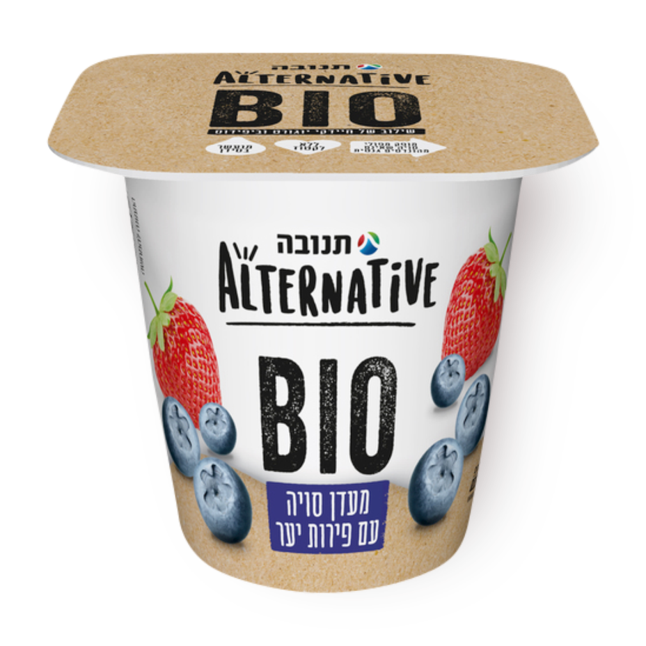Soybean extract (75%) (water, soybeans 7%), sugar, cooked fruit (blueberries 6%, strawberries 3%), glucose syrup, processed starch (E-1442), nutritional supplement: calcium: tricalcium phosphate ( of which calcium 0.13%), stabilizers (pectin, carob seed stabilizer), flavoring agents, salt, acidity regulators (citric acid, sodium citrate, sodium carbonate), preservative: potassium sorbate, vitamin D (1 mcg per 100 grams). With the addition of yogurt bacteria and bifidus bacteria. Contains fruit, may contain fruit parts. *Kosher product for Passover does not contain vitamin D.