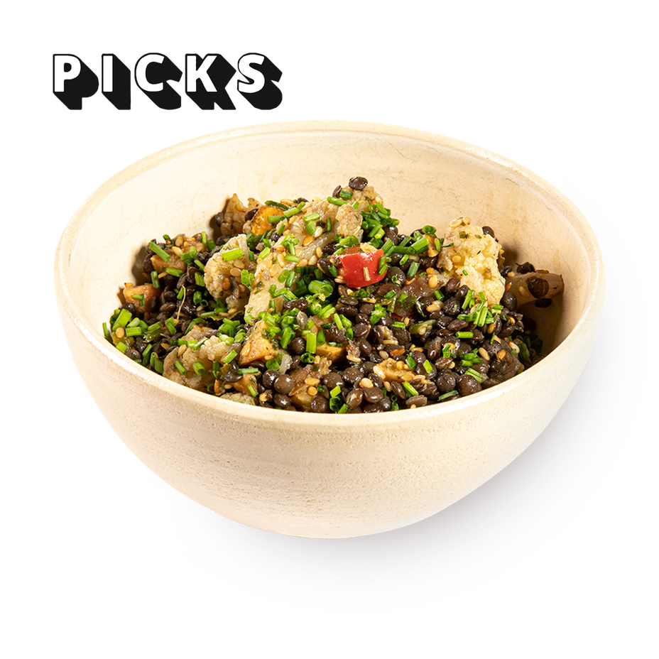 Black lentil salad with cauliflower, sweet potato and red pepper plus chimichurri, fresh herbs, and tahini.