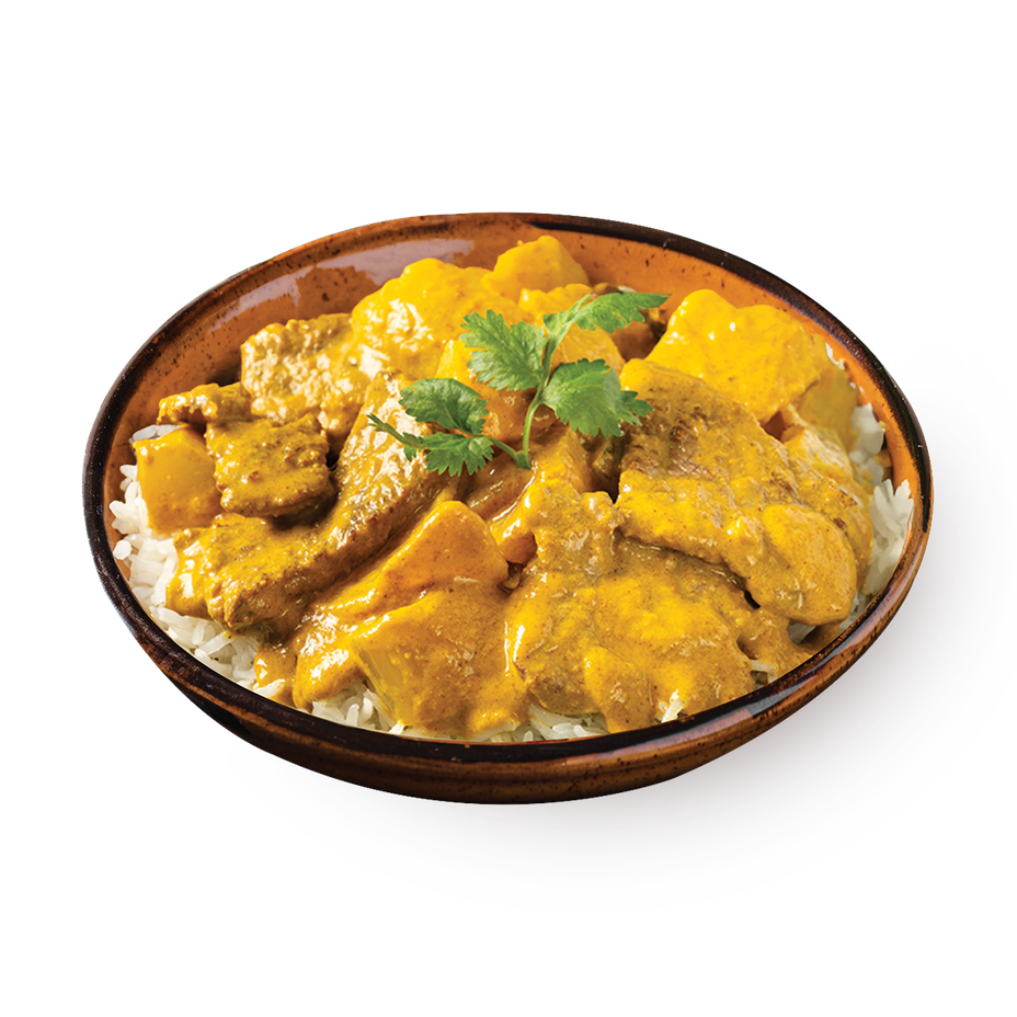 Beef 34%, potato, water, coconut cream, basmati rice onion 10%, yellow curry 2.4% (garlic, lemon grass, salt, shallots, galangal, dried red chili pepper, coriander seeds, kaffir lime leaves, curry powder, cumin, cinnamon, turmeric, cardamom, nutmeg), sugar, soy sauce [water, soybeans, wheat (contains gluten), salt, alcohol], canola oil, salt, tapioca starch, basil, turmeric, stabilizer ( xanthan gum)