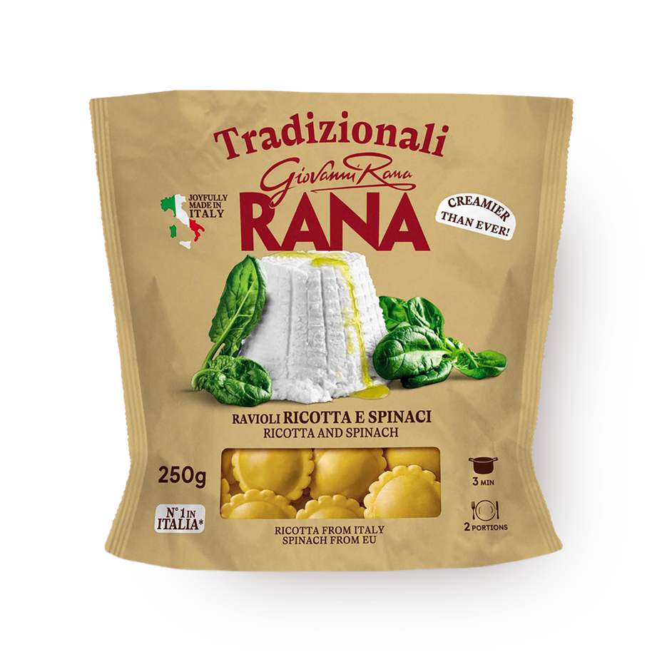Filling (58%): Soft ricotta cheese (41%) (whey (milk), milk, salt), spinach (15%), whey powder (milk), cream (milk), grated cheese (7%) (milk, salt, enzymes), mascarpone cream cheese (milk) (6%), sunflower oil, wheat fiber, garlic, breadcrumbs (wheat flour, yeast), salt, flavorings. Pasta (42%): wheat flour, eggs (30%), durum wheat semolina. May contain: nuts (almond, pistachio, walnut, hazelnut), shellfish, crustaceans, mustard, soy and celery.