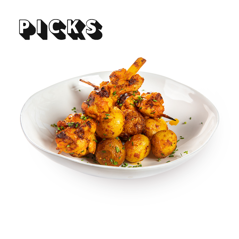 Roasted chicken skewers marinated in coconut cream and aromatic spices, with potato and ginger