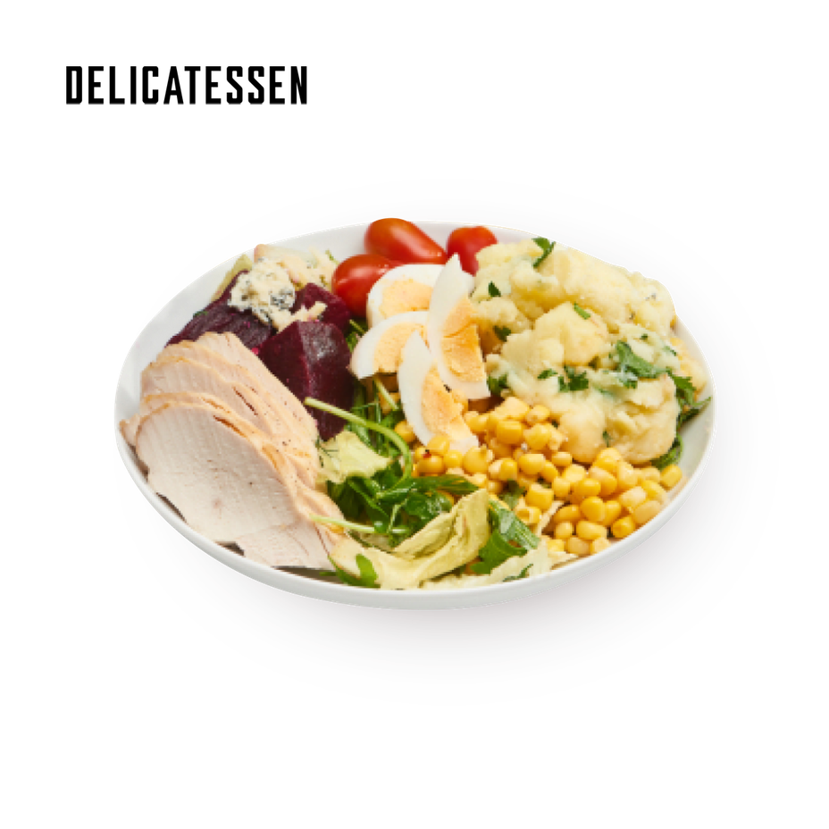 Chicken, potatoes, cherry tomatoes, lettuce, eggs, corn, beets, blue cheese, rocket, vinegar, canola oil, parsley, sour cream, sugar, water, salt, mustard, silane, honey, emulsion stabilizer (contains: maltodextrin, starch processed (E1422), stabilizer (E415), emulsifier (E433)), black pepper, garlic.
