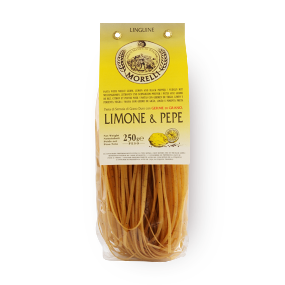 Durum semolina flour (gluten), water, wheat germ, natural lemon flavoring, pepper powder, concentrated lemon juice.