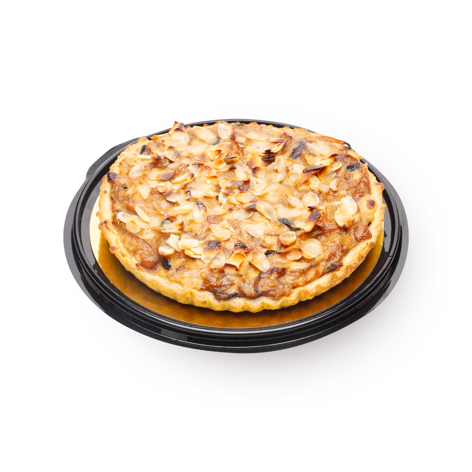 Wheat flour (contains gluten), onion (24%), butter, milk, water, semi-hard cheese 28% fat [preservative (E202), food coloring (E160b)], hard cheese 30% fat Pecorino type (3%) (pasteurized sheep's milk, salt), white cheese 9% fat, soybean oil, almonds (2%), pears (2%), white sugar, sweet cream 42% fat, egg liquid (eggs, salt), salt, corn starch , vinegar, black pepper, ground nutmeg.