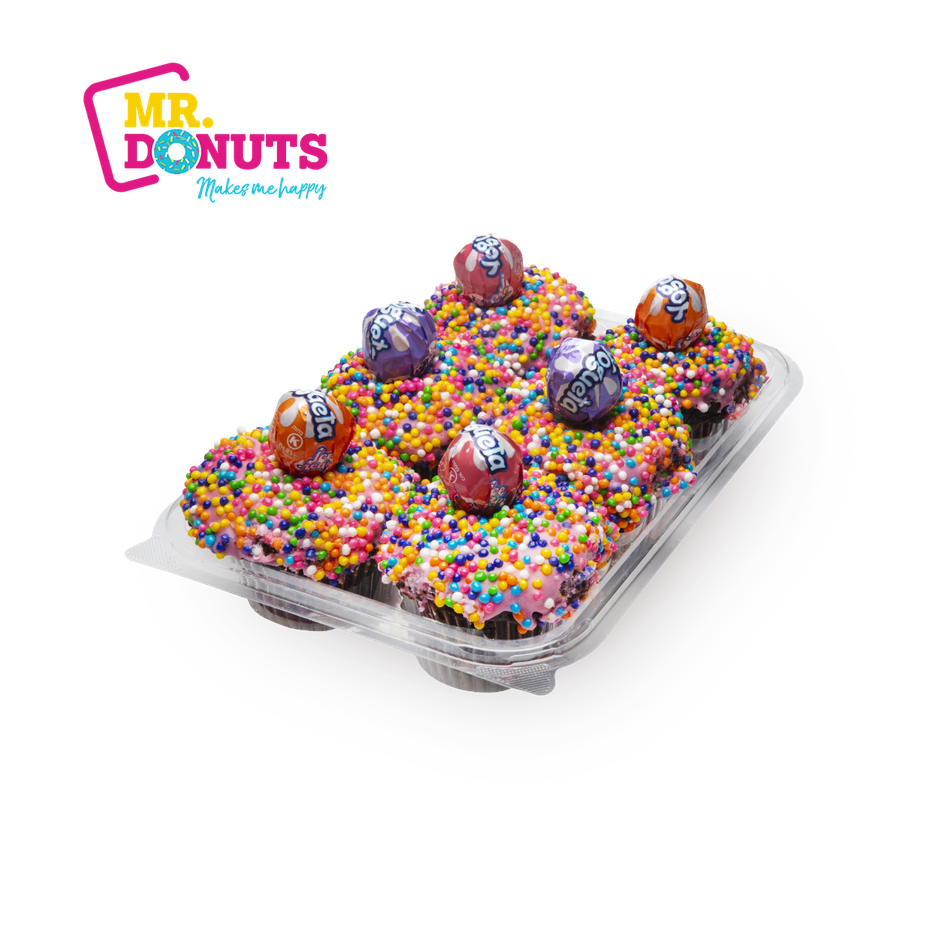 A box of 6 cupcakes frosted with colorful candies and a Yogurt lollipop