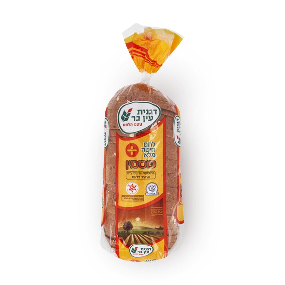 לחם חיטה מלא בתוספת קמח כוסמין מלא, גרעיני צ'יה ודלעת .750 גר
