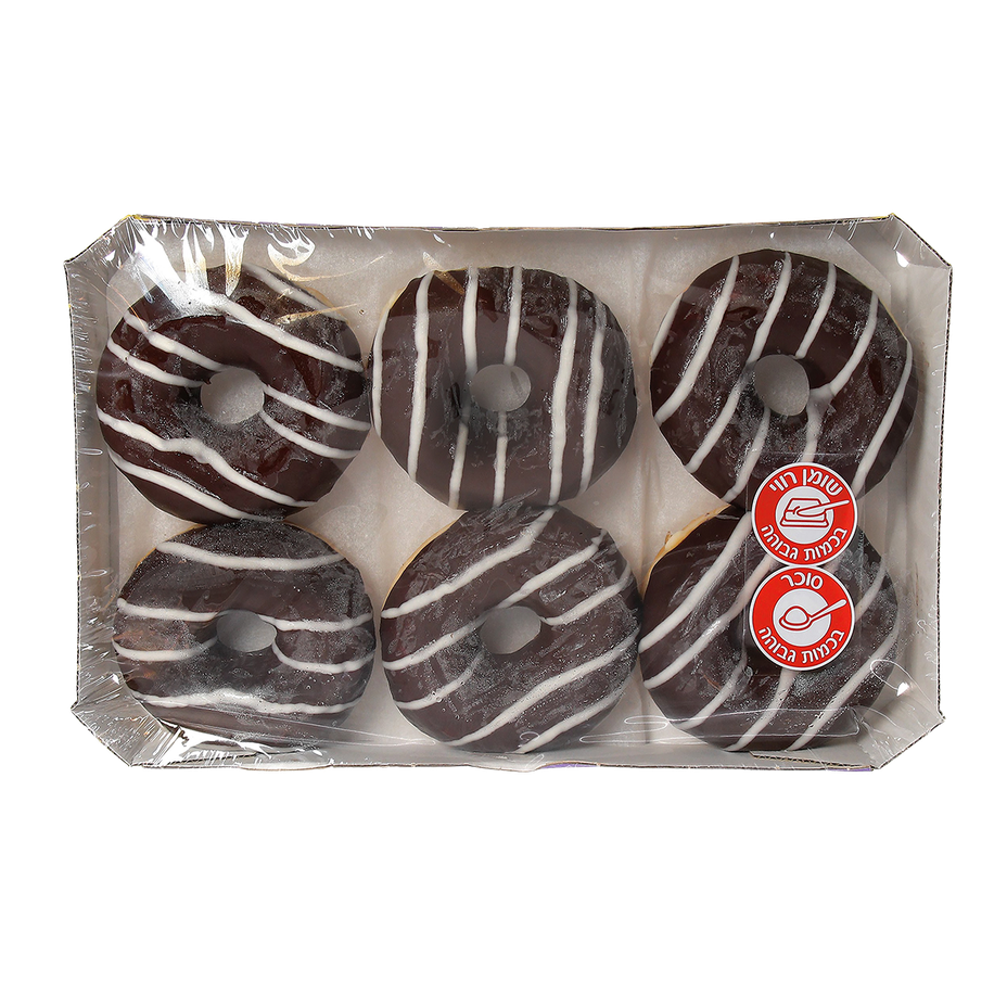 Donuts with chocolate flavor coating and vanilla flavor decoration stripes