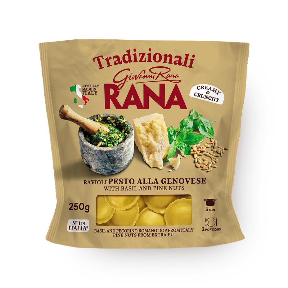 Filling (58%): Basil, cheese and pine nut mixture (32%) [sunflower oil, basil (9%), hard pecorino cheese (sheep's milk, salt, rennet) (3%), hard parmesan cheese (milk, salt, rennet), pine nuts (2.6%), almonds, salt, extra virgin olive oil, garlic], soft ricotta cheese (25%) (whey (milk), milk, salt), cream (milk), sour cream (milk), whey powder (milk), butter (milk), dietary fiber (chicory, wheat), flavorings, lactose (milk), breadcrumbs (wheat flour, water, salt, yeast). Pasta (42%): wheat flour, eggs (30%), durum wheat semolina. May contain: nuts (almond, pistachio, walnut, hazelnut), fish, shellfish, crustaceans, mustard, soy and celery.
