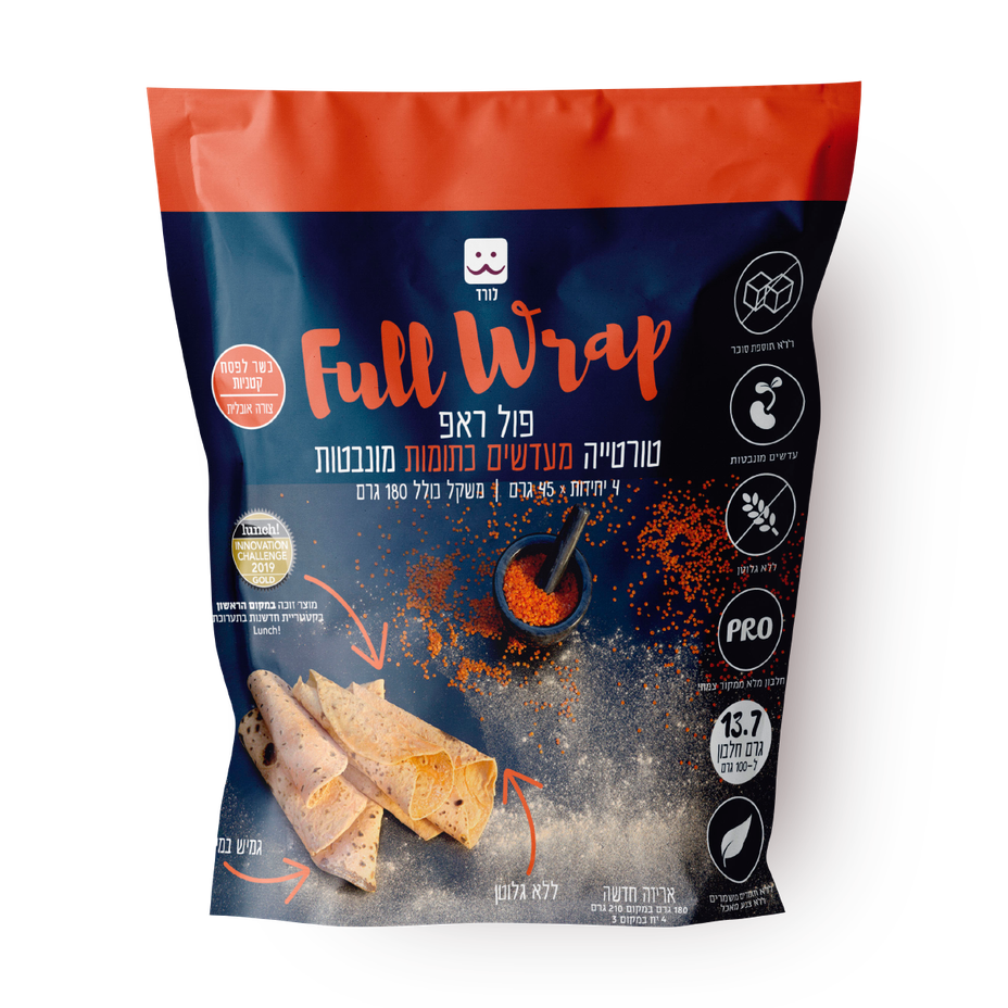 Full Wrap – Tortilla from sprouted orange lentils, rich in complete protein, 13.7 grams of protein per 100 grams of tortilla. Vegan, gluten-free, no preservatives, no added sugar or food coloring. Suitable for a variety of recipes - lasagna, pizza, sandwiches, tacos, nachos, burritos and even pie for dessert
