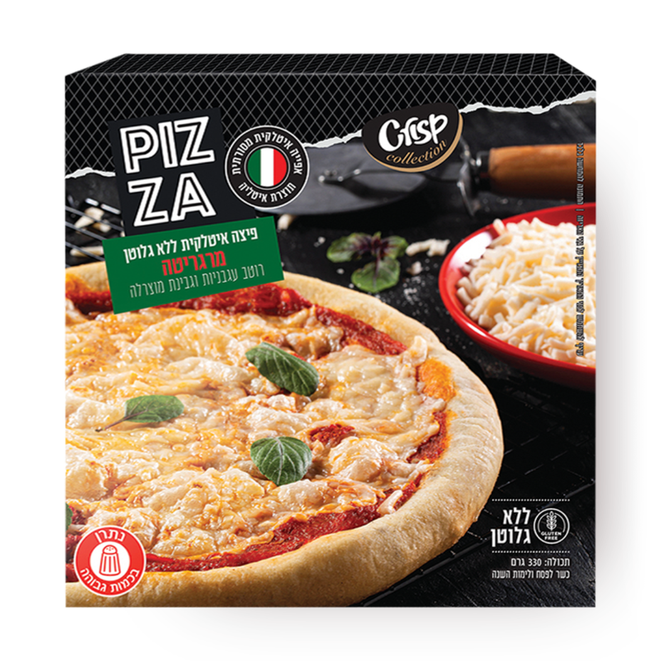 בצק (%60 (תערובת עמילנים וקמחים [עמילן תירס, עמילן אורז, קמח תירס, סיבים תזונתיים (אפונה, פסיליום, במבוק, זרעי פשתן, אורז,תפוח אדמה), סוכר, קמח אפונה, קמח דוחן, זרעי פשתן, קמח כוסמת, חומר טעם וריח, מסמיך (E464 ,(מתפיחים [E575), ii(E500 ,[מים, שמן זית, מלח, שמן חמניות, שמרים), רוטב עגבניות (%21) (עגבניות, מלח), גבינה חצי קשה %20 שומן מסוג מוצרלה (%19) (חלב, כשר לפסח ולימות השנה מלח, אנזים רנט, תרבית לקטית), אורגנו מיובש.
