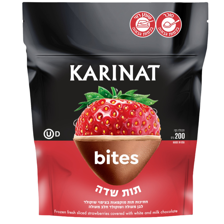 Karinat Bites frozen fresh sliced strawberries covered white and milk chocolate