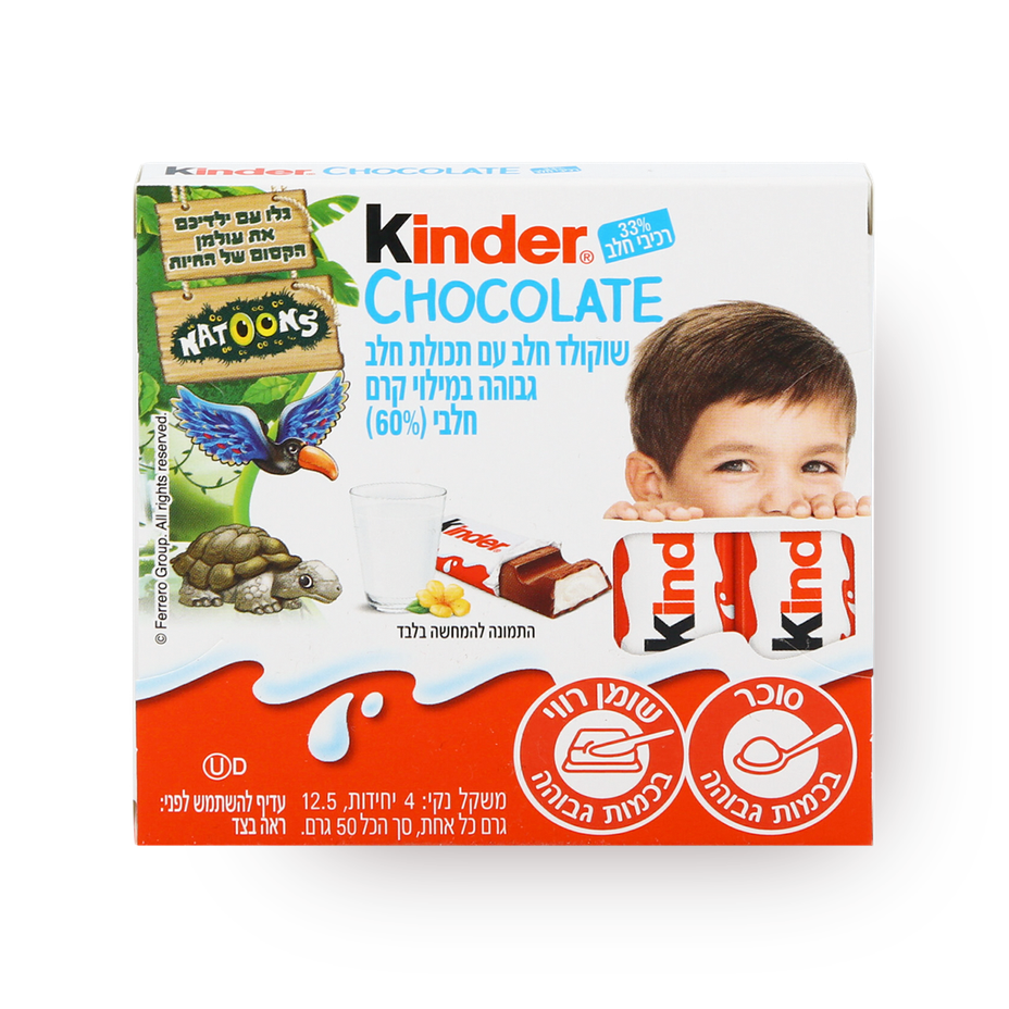 16.9 ₪Tagged ingredients: gluten, High Saturated Fat, High Sugar, kosher13.1 ₪ / 100 g - Kinder Chocolate with cereals pack4 × 23.5 g