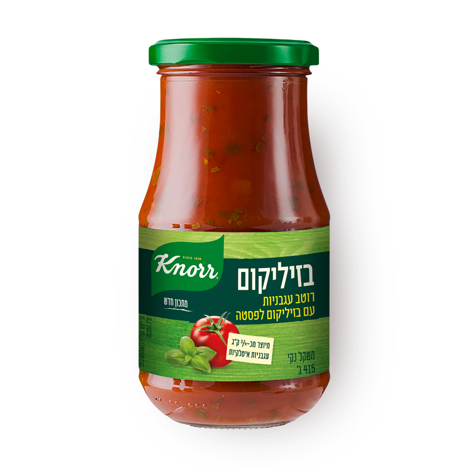רוטב עגבניות בזיליקום רוטב עגבניות מרוכז ומתובל מיוצר מכ-3/4 קג עגבניות איטלקיות. ללא תוספת חומר משמר. ללא תוספת מונוסודיום גלוטמט. ללא צבעי מאכל.