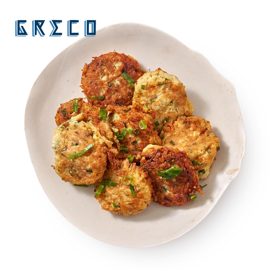 Grated potato, grated white onion, leek, egg batter, feta cheese, parmesan, self-rising flour, green onion, chopped dill, corn flour, salt, baking powder, black pepper