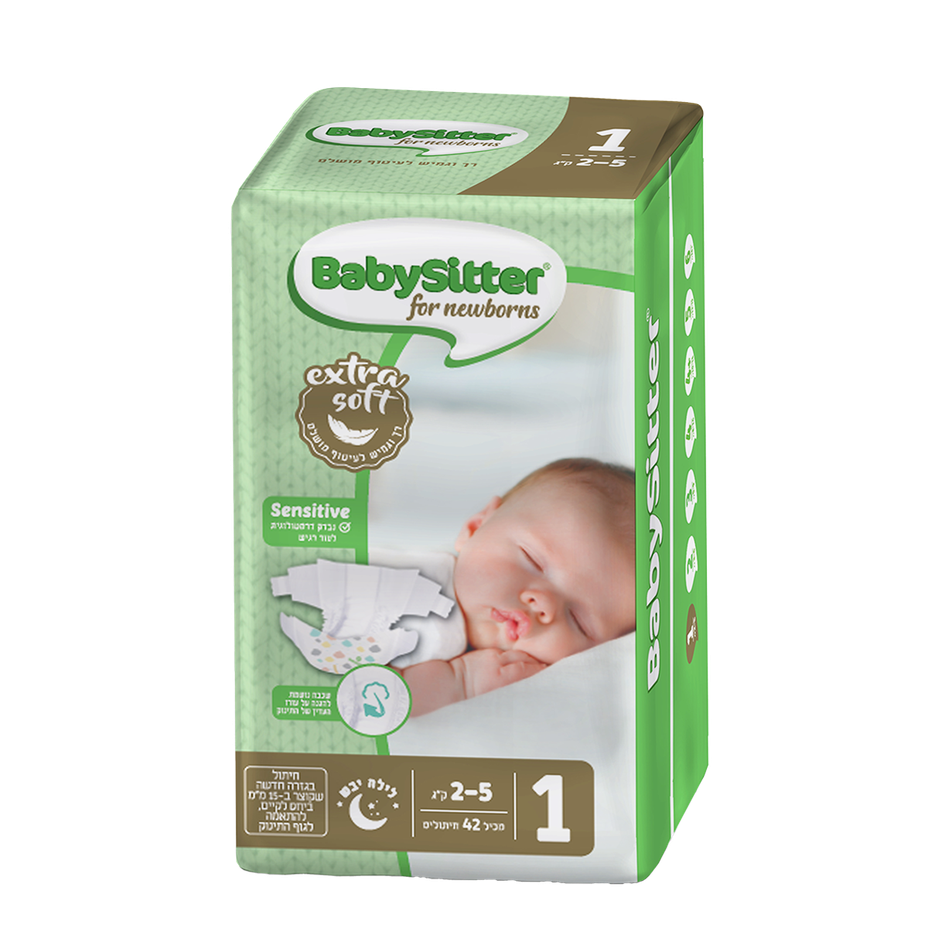 42 pc.• SENSITIVE - dermatologically tested and adapted to the baby's sensitive skin • Hypoallergenic • extra soft - the diaper is soft and flexible for a perfect wrap and maximum comfort for the baby • Wetness marker - the convenient way to know when to change a diaper! • Fluid capture mechanism for increased absorption and protection from leaks • A breathable layer to protect the baby's delicate skin • Front opening to the navel area • Babysitter diapers are available from newborn size to size 6