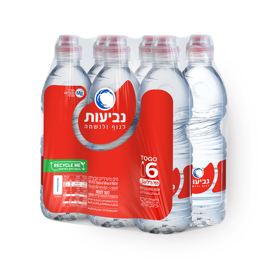 Six bottles of Neviot mineral water with the ideal TOGO cap for convenient opening and accessible use throughout the day. Neviyot water bottles are made from 50% recycled plastic