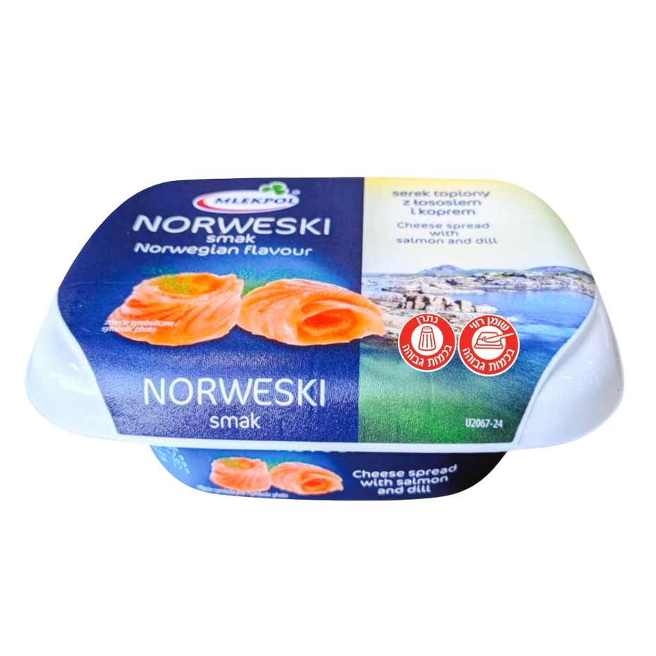 Cheese (milk, salt, sourdough bacteria, stabilizer: calcium chloride, preservative: potassium nitrate, lysozyme, food coloring: Anto), water, butter, cheese, salmon 8% (smoked Atlantic salmon, salt), milk powder, emulsifiers ( 452E, 331E, 339E, 340E), dill 0.2%, preservative: 234E.