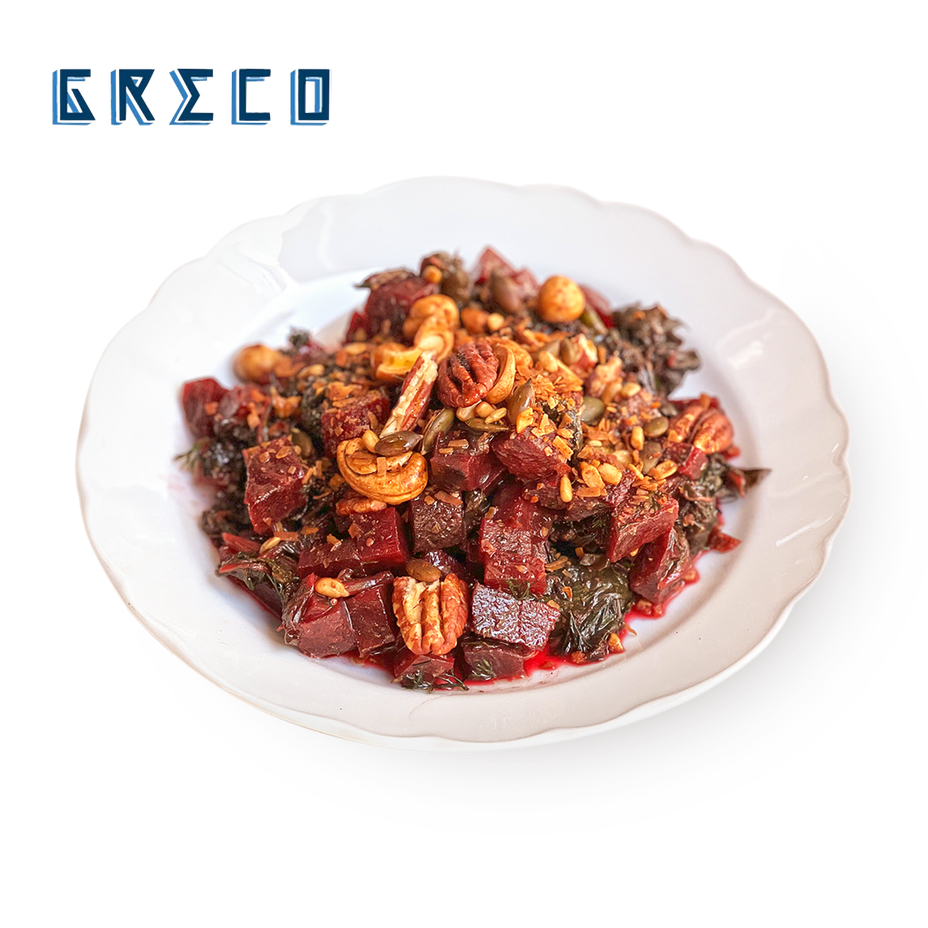 Beets (56.2%) black cabbage, chard, olive oil, pomegranate concentrate, mixed nuts (1.6%) (cashews, hazelnuts, walnuts, toasted coconut, pecans, pumpkin seeds, sunflower seeds, water, salt, sugar, spices, cinnamon, nutmeg, oregano, ground shata pepper), dill, vinegar, honey, table salt, mustard, black pepper, oregano.