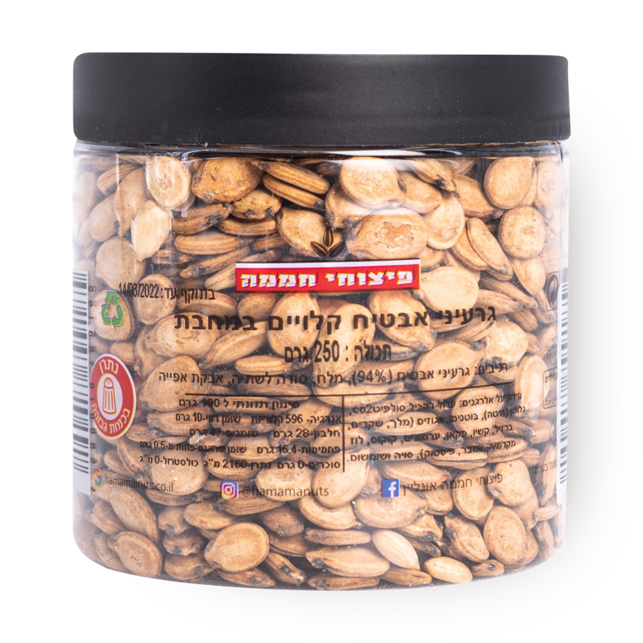 19.9 ₪Tagged ingredients: gluten, High Sodium, kosher7.96 ₪ / 100 g - Roasted watermelon seeds in a bag200 g