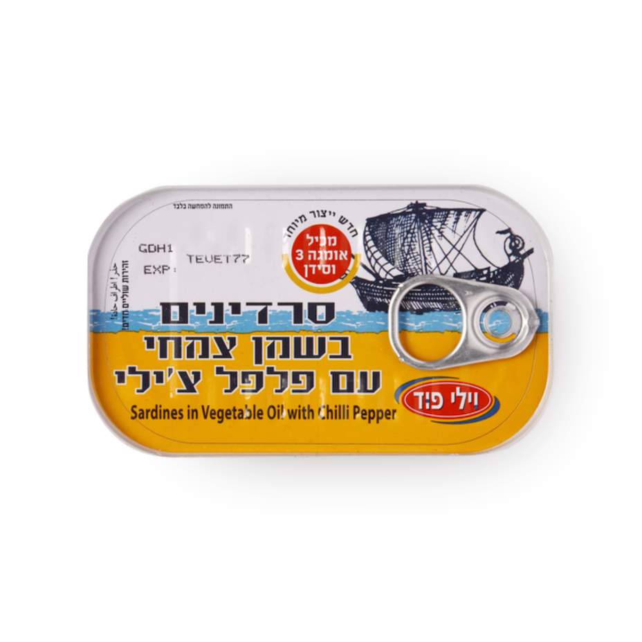 סרדינים, שמן צמחי (שמן סויה), מלח, תבלין פלפל צ'ילי (0.6%)
