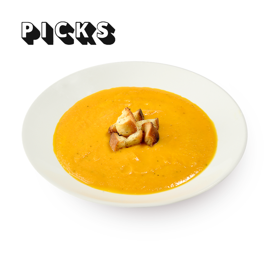 Carrot, pumpkin & sweet potato soup seasoned with thyme, coriander seeds, allspice and nutmeg. Warm-up instructions: