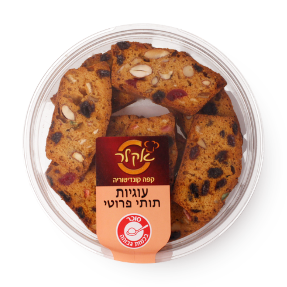 רכיבים: קליפות הדרים[סוכר,קליפות מתפוז(29%),גלוקוז,מים,חומצת מאכלE330,חומר משמרE202,צבע מאכלE122,טוטרזיןE102,E133.], ביצים, קמח חיטה (גלוטן), סוכר לבן, צימוקים, שקדים, דובדבנים מסוכרים[סוכר,דובדבן,גלוקוזה,מים,חומצת מאכלE330,חומר משמרE202,צבע מאכלE122,חומרי טעם וריח.], שומן צמחי (שומנים צמחיים ושמנים צמחיים מוקשים,מים,מתחלבים(לציטין סויה,E471),חומצת לימון,חומר משמר(E202), אבקת אפיה : חומר תפיחה (E500, E450).