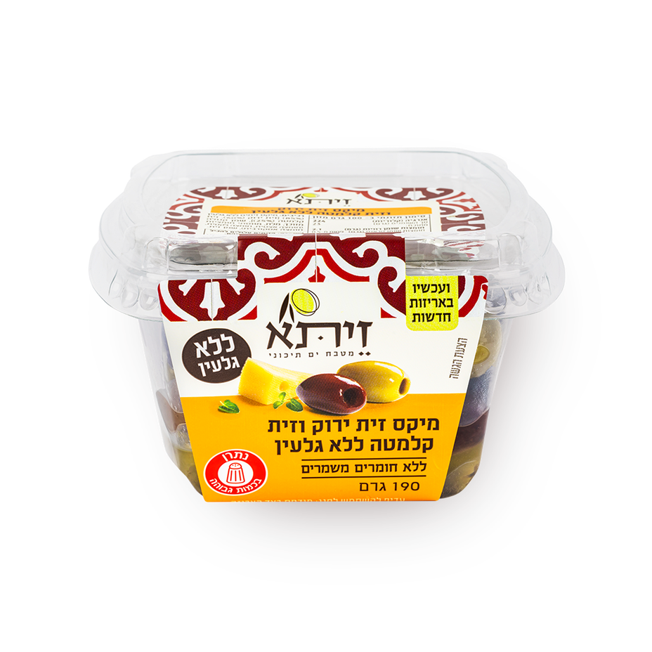 6.9 ₪Tagged ingredients: gluten, High Sugar, kosher5.75 ₪ / 100 g - Zeita Mix Olives + Cornish190 g