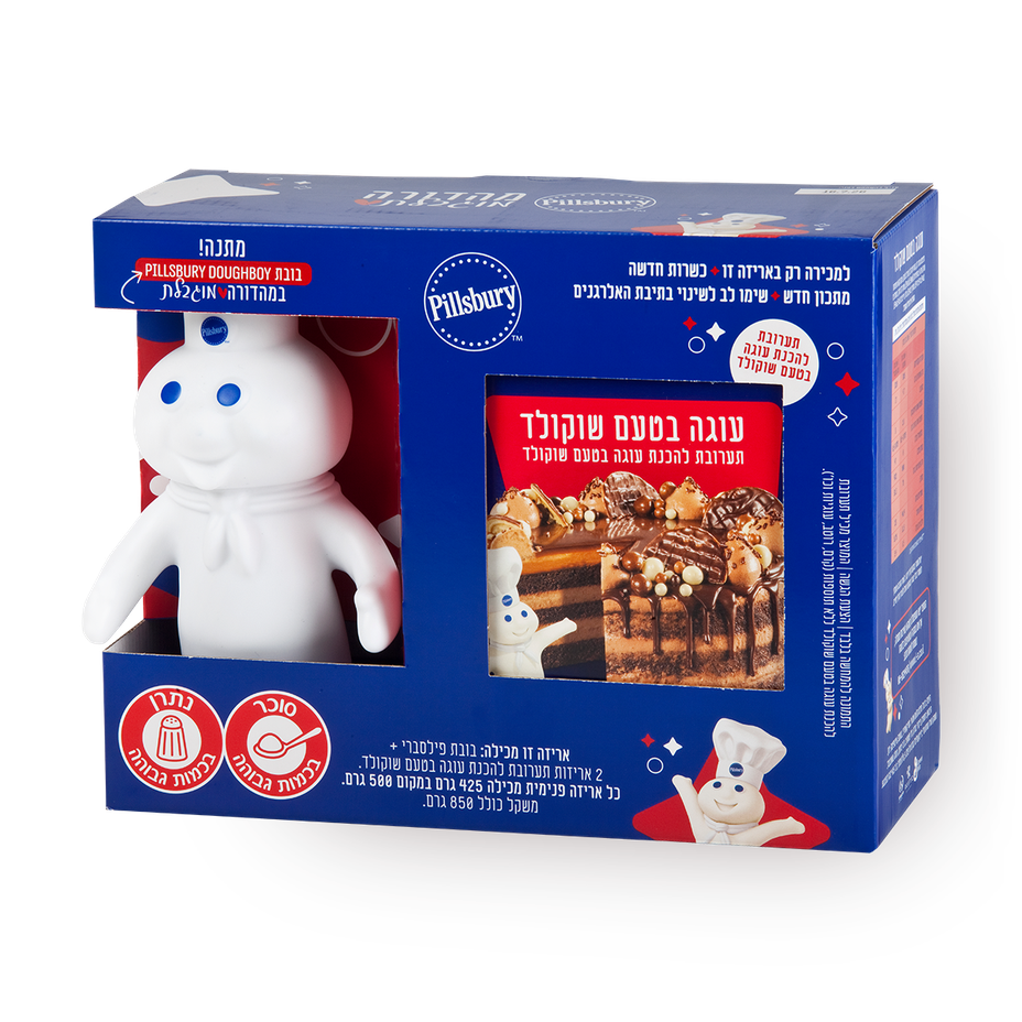 מארז מהדורה מוגבלת מבית פילסברי- האריזה מכילה: בובת פילסברי+ 2 אריזות תערובת להכנת עוגה בטעם שוקולד. כל אריזה פנימית מכילה 425 ג׳. משקל כולל 850 ג׳.