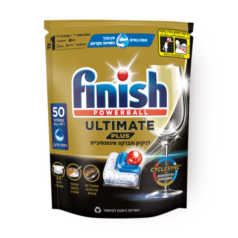 • פיניש אולטימייט פלוס בניחוח מרענן - לניקיון אינטנסיבי במדיח הכלים ולברק נוצץ כיהלום בכל שימוש. • הקפסולה המתקדמת ביותר שלנו בעלת טכנולוגיית ה-CYCLESYNC המאפשרת התמוססות הדרגתית, ובכך כל מרכיב ניקיון פועל בשלב המתאים ביותר בתהליך ההדחה. • קפסולה המגנה ומטפלת בכלי הזכוכית והסכו""ם ושומרת על הברק שלהם לאורך זמן. • הקפסולה מספקת 4 פעולות ניקיון לאורך מחזור השטיפה: ניקיון אינטנסיטי, התמודדות עם כתמים שרופים ללא שטיפה מוקדמת , הברקת הכלים והגנה.