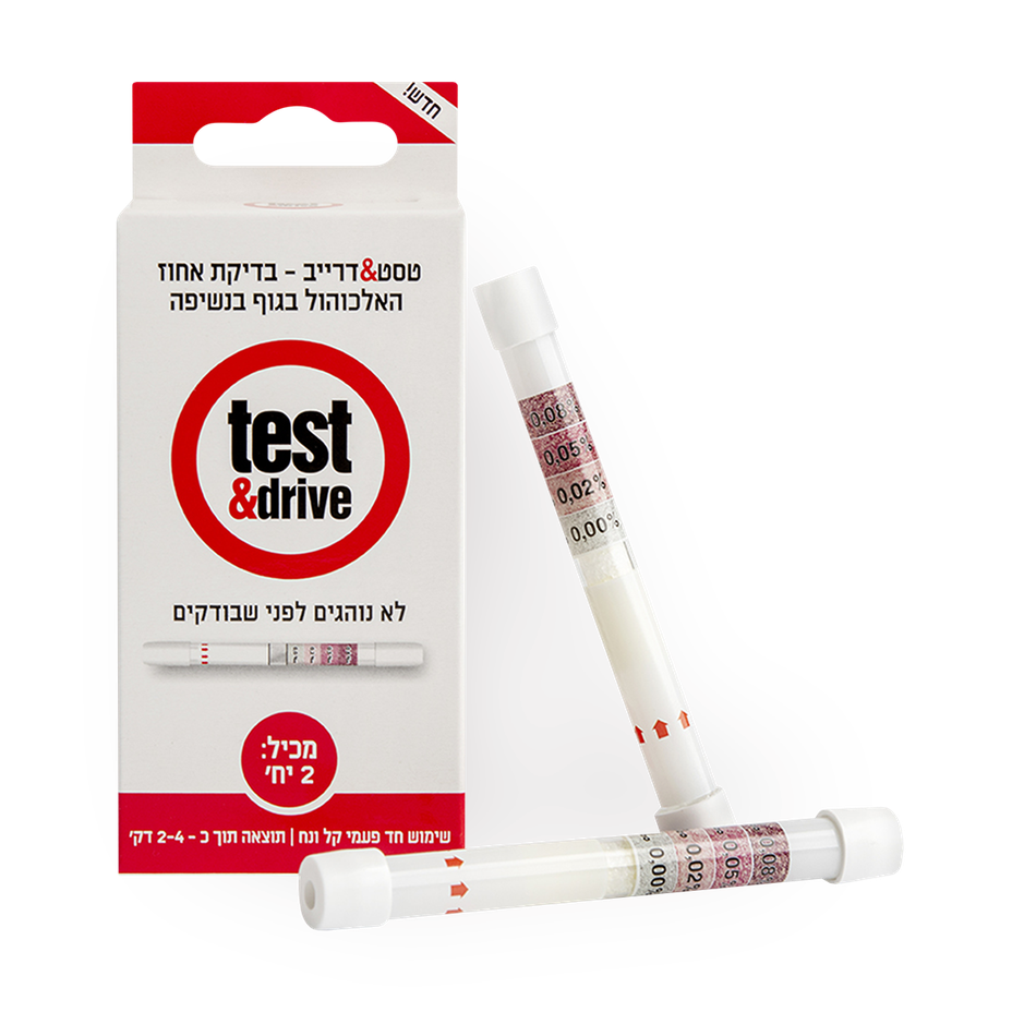 טסט& דרייב- בדיקת אחוז האלכוהול בגוף בנשיפה. לא נוהגים לפני שבודקים!תכולת האריזה: מכילה 2 ערכות בדיקה הכוללות: צינורית זכוכית, מודד החומר-ראגנט, רדיד אלומיניום ושני מכסי מגן.